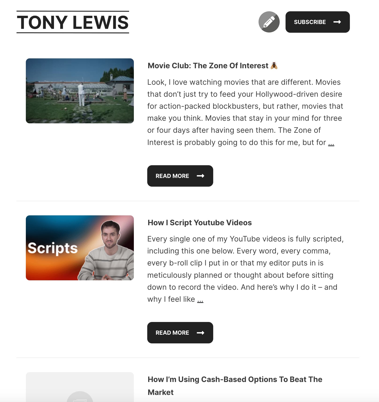 Moving on to the blog page, again, I have a very minimal one that I’ve designed with Thrive Theme Builder. It follows the same sort of design guidelines as substack, although I’m sticking to black and white for the most part when it comes to color sheme. And of course, all of my most recent content pieces are featured here sorted by publication date.